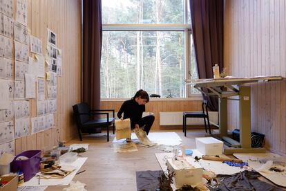 El día antes de subir al avión, la artista Mónica Mays estaba haciendo la mochila —tres cambios de ropa, un cuaderno, una baraja de tarot, el libro Hongos al final del mundo: sobre la vida después de las ruinas capitalistas, de Anna Tsing, y el ordenador— para acudir a la residencia Rupert en Lituania, su siguiente “espacio de incubación”. Iba a elaborar piezas escultóricas con artesanos de antiguas fábricas soviéticas, ya ancianos, pero garantes del conocimiento de la elaboración de objetos domésticos bisagra entre la modernidad (de antes) y el folclore local (de siempre). Tres días después, Mays y sus cosas, ya instaladas en su nuevo hogar temporal en Vilna, fueron arrolladas por la pandemia. No podía volar de vuelta, pero tampoco podía desarrollar su cometido por las restricciones. La colaboración con los trabajadores locales era imposible, al pertenecer a colectivo en situación de riesgo por su edad. Bibliotecas, archivos, museos y colecciones cerrados: “Solo recibí mensajes automatizados out of office”, dice una Mónica Mays que estaba locked in the office: “Estuve tres meses prácticamente sola en el edificio de la residencia, que se encontraba en medio de un bosque a varios kilómetros de la ciudad”. Le quedaba el paisaje. Y se convirtió en paisaje: “Mi estudio se llenó de caracoles, musgo, flores, anotaciones y dibujos hechos en mis solitarios paseos diarios”. Lejos de lamentarse, apreció el impulso: “De la manera en la que sucedió todo, me volví hacia métodos mucho más personales e introspectivos trabajando desde dentro hacia afuera para abordar los temas que buscaba trabajar desde fuera hacia dentro”.