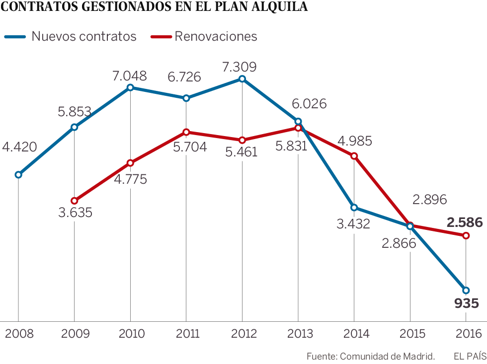 En la web del Portal de Vivienda de la Comunidad de Madrid aparecen los datos de evolución del Plan Alquila, que se puede ver en el gráfico que acompaña a este texto. Sin embargo, un portavoz de la Consejería de Transportes y Vivienda insiste en que en su departamento “no están seguros” de que la cifra publicada sea la definitiva de 2016. En todo caso, admite una bajada importante que achaca a que en la mayor parte del año —desde marzo— no se pudo renovar el acuerdo con la empresa que ayuda a gestionar esos contratos, por lo que lo tuvieron que hacer únicamente los funcionarios en lo que el Gobierno calificó como “servicios mínimos”. La culpa de que no se pudiera renovar, asegura, fue de la oposición en la Asamblea de Madrid, que bloqueó la partida de 2,5 millones de euros con la que debía hacerse. No obstante, ese contrato se ha renovado por fin este enero.