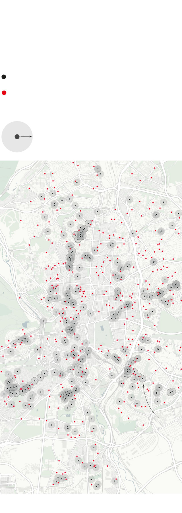 Metodología: Para identificar los salones se ha utilizado el Censo de Locales y sus Actividades del portal de datos abiertos del Ayuntamiento de Madrid. Se han tenido en cuenta únicamente los 342 locales abiertos cuya actividad asociada es "Juegos de azar y apuestas de gestión privada (bingos, casinos, máquinas tragaperras)". La lista de centros docentes incluye seis tipos: Institutos de Enseñanza Secundaria, centros privados de infantil, primaria y secundaria; centros privados de secundaria; centros privados de formación profesional, centros públicos de formación profesional y centros públicos integrados de formación profesional. Ambas bases de datos son de 2018 y pueden recoger inconsistencias al provenir de un registro administrativo, como señalan las propias administraciones. Por ejemplo, existen locales de juego asociados a otra actividad. La geolocalización puede ser imprecisa en algunos casos.