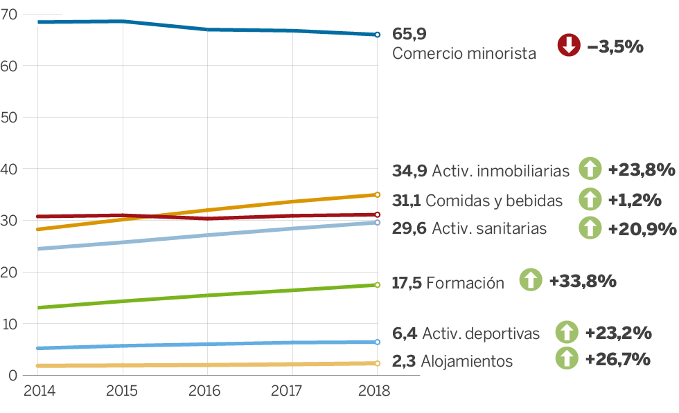 Mientras, los negocios que venden experiencias o servicios irreemplazables por un clic, sobreviven o crecen. Así ha sucedido en Madrid en los últimos cinco años con hoteles y servicios de alojamiento (+26%), academias de formación (+33%), actividades sanitarias (+20%), actividades deportivas (+23%) o salones de tatuajes (+94%).