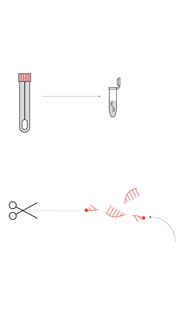 El test se basa en una muestra tomada de la nariz o la boca del paciente. Primero se añaden productos químicos para transcribir el ARN en ADN, pues la Cas12 solo sabe cortar ADN. Si hay virus, la plantilla que sirve de guía se une al genoma del virus y activa la Cas12, programada para cortar las cadenas de material genético de una sola tira que haya en la muestra. De ese modo también corta la tira fluorescente y la hace brillar. Por último se realiza un test de flujo lateral, un proceso sencillo muy parecido a los de embarazo, y aparece entonces una segunda barra negra que indica una infección. Todo el proceso requiere poco más de 40 minutos.