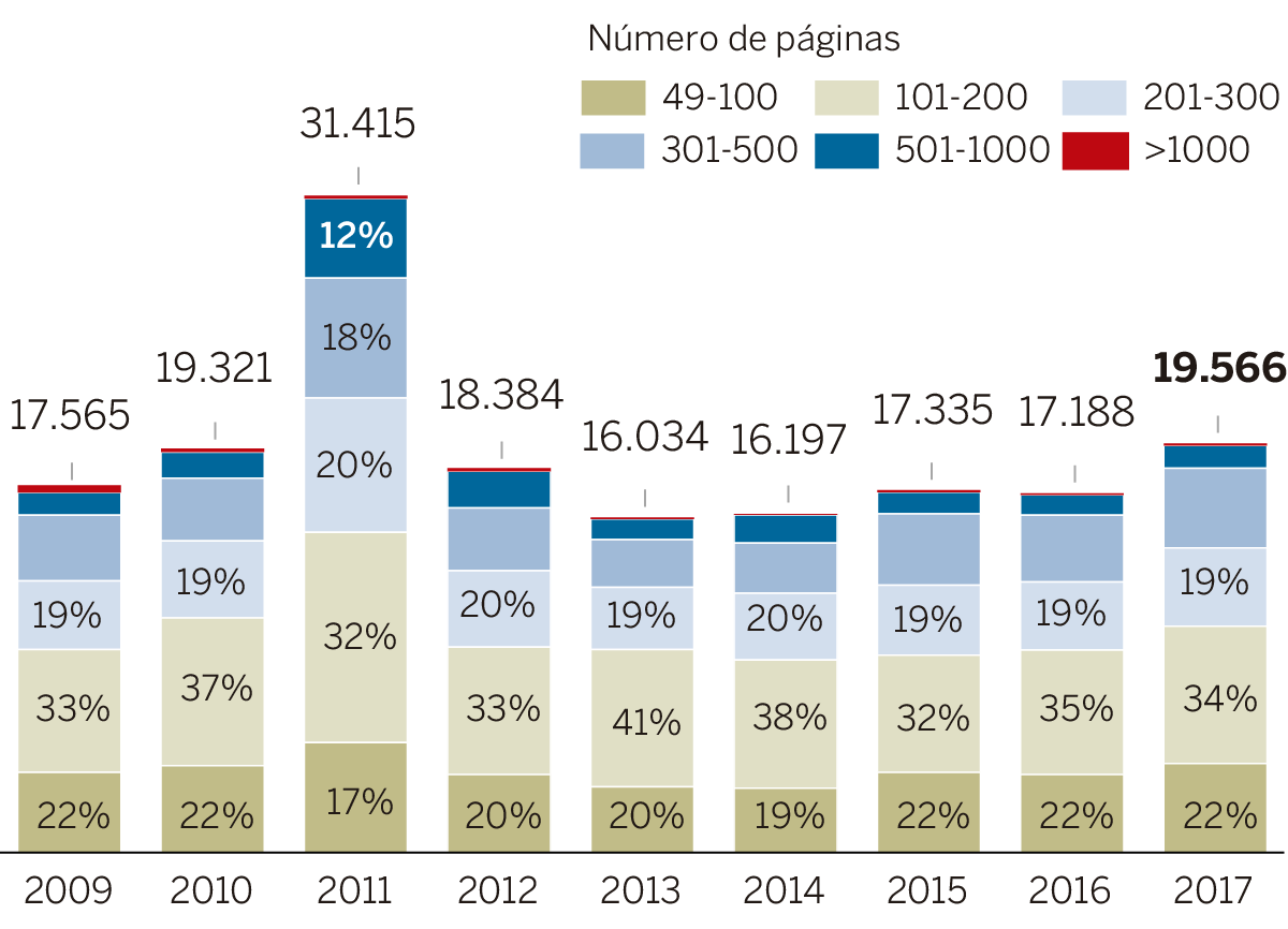 En España, el ISBN (la agencia que cataloga los libros que está gestionada por Federación de Gremios de Editores de España) descubre una tendencia que podría estar vinculada con esa tormenta perfecta contra el hábito de la lectura. Las editoriales cada vez producen libros más cortos. En la última década ha crecido el número de títulos en la calle, pero con menos páginas: la media fue, en 2017, de 243 páginas en la categoría “creación literaria”. En 2009 la extensión media del mismo capítulo fue de 265 páginas. Más de 20 páginas de recorte, según las estadísticas del registro que audita al sector editorial. Y un crecimiento en la oferta breve: el 50,8% de la creación literaria son libros de menos de 200 páginas. Hace una década eran menos, el 46,3%. Ampliamos detalle y vemos que en 2017 se publicaran 6.573 títulos con una extensión entre 101 y 200 páginas; 3.740, entre 201 a 300 páginas; 3.816, de 301 a 500; y 1.078 con 501 a 1.000 páginas. En 2011 hubo un repunte de títulos, debido a la sobreproducción de novedades y digitalización (ver gráfico).