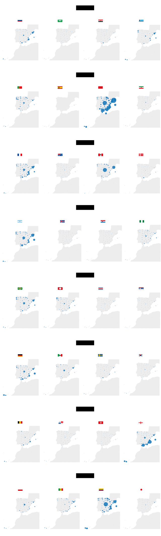 Los gráficos muestran el tamaño y distribución de las comunidades de inmigrantes en el territorio español. Los círculos representan el número de nacidos en el extranjero empadronados en cada provincia, según el Instituto Nacional de Estadística a fecha de 1 de enero de 2017. Junto a la bandera aparece el tamaño de esa comunidad en todo el territorio nacional. Como no existe una encuesta de afinidades mundialistas, hemos usado como medida aproximada del tamaño de las hinchadas el criterio de "la cuna define tus colores".
