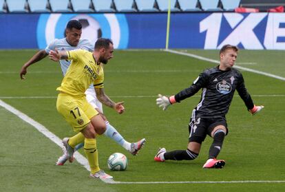 El gol postrero en el minuto 90 castigó al Celta, que nunca transitó parejo a su rival, pero que creyó sobrevivir a un duelo en el que no sobró producción ofensiva. Sí que hubo esgrima. En un entorno en el que sobraban vacíos el partido se sustanció en la negación de los espacios, en el despliegue para buscar la pelota en campo contrario y hacer daño tras recuperarla. Pero solo el Villarreal le supo dar continuidad a sus intenciones. El Celta se acható porque cuando tuvo que buscar la pelota padeció ante la finura del contrario. Y cuando le tocó manejarla no supo gestionarla. Sufrió, sobre todo en la primera parte, un monumental repaso porque el verde de Balaídos fue amarillo. Una acción ya casi al filo del descanso delató lo que ocurría: Alberto Moreno y Moi Gómez llegaron en franquía a la línea de fondo para ejecutar un centro con comodidad. Pero se estorbaron. La jugada tuvo un tinte verbenero que extrajo de Moi Gómez una sonrisa. El Villarreal se estaba divirtiendo.
