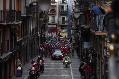 Pero siendo tan navarro como es Carapaz más navarro es aún Soler, quien, aunque nacido en Vilanova i la Geltrú, también creció como ciclista en el Lizarte y le salieron los dientes en las carreteras vascas, y más navarro es su equipo, y más de la tierra es aún su director, José Luis Arrieta, de Uharte Arakil, al pie de la subida en la que Soler agarra el mando del pelotón y lo deja reducido a casi nada, pues su ritmo desatado solo lo resisten los mejores, Roglic y su inseparable Kuss, sus compañeros Valverde y Mas, Chaves, Carapaz, que ha sido absorbido, Dan Martin, Chavito…