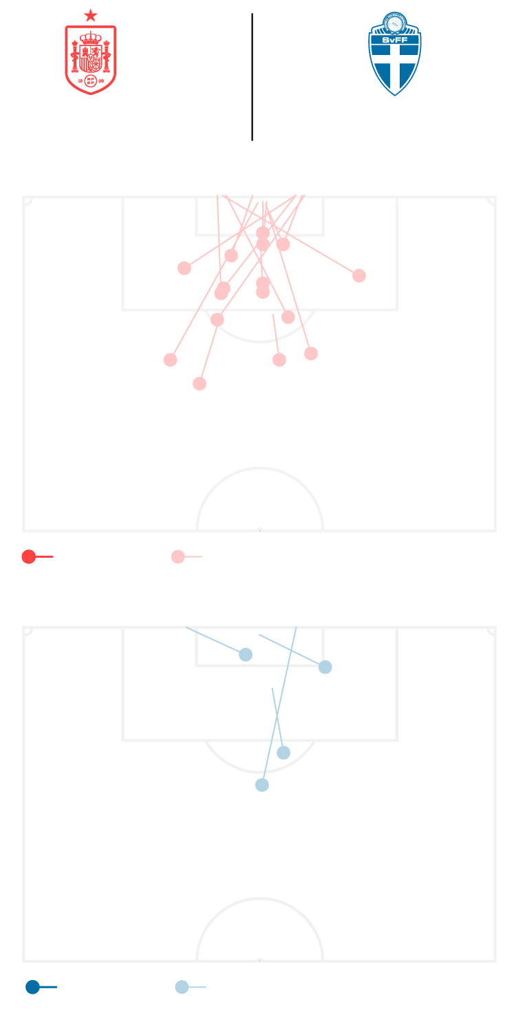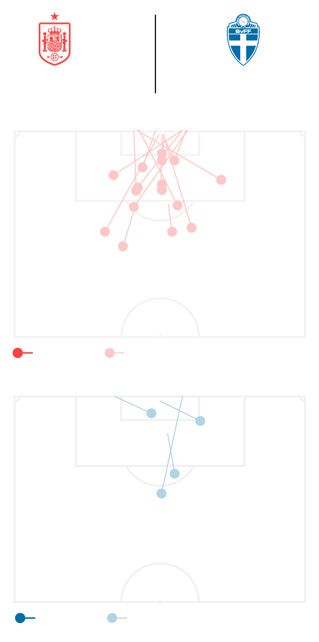 Ante la muralla plantada por los suecos en la frontal de su portería, la selección usó a sus laterales para crear una pinza en torno al área rival. Pau, Jordi Alba y Pedri formaron un triángulo en la izquierda y Laporte, Marcos Llorente y Koke hicieron lo mismo por la derecha. Estas fueron las asociaciones más repetidas en el partido, con muy poco acierto a la hora de centrar. Morata fue un faro, incapaz de conectar con sus compañeros y encerrado entre los centrales de Suecia.