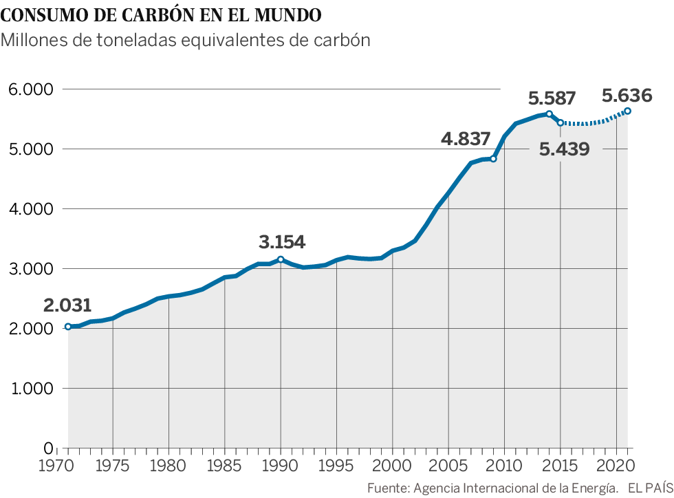 Sin embargo, algo comenzó a cambiar en 2014, cuando la demanda se estancó. El informe presentado este lunes confirma una caída en 2015 del 2,7% respecto al año anterior: se pasó de una demanda global en 2014 de 5.588 millones de toneladas equivalentes de carbón (una unidad de energía) a 5.440 en 2015. Si se toman como referencia solo las toneladas (unidad de masa) consumidas el descenso comenzó un año antes: en 2014 cayó la demanda un 0,9% respecto a 2013.