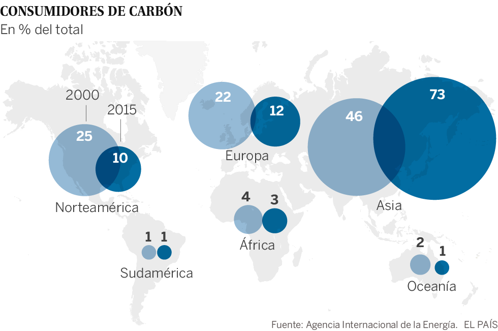 El análisis muestra claramente que el uso del carbón ha viajado desde Occidente a Asia en los últimos tres lustros. En 2000, Norteamérica y Europa consumían el 47% del total. En 2015, había bajado hasta el 22%. Mientras, Asia ha pasado en esos 15 años del 46% al 73% de la demanda mundial.