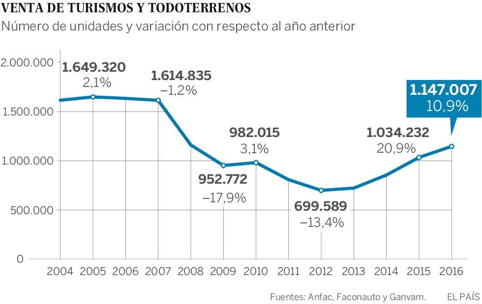 Las matriculaciones de turismos y todoterrenos en el mercado español se situaron en 1,14 millones de unidades durante 2016, lo que supone un aumento del 10,9% en comparación con los datos de 2015, según informaron las asociaciones de fabricantes (Anfac), concesionarios (Faconauto) y vendedores (Ganvam). Una mejora que permite alcanzar los mejores datos desde 2008, aunque el crecimiento se ha moderado —del 20,9% de 2015 al 10,9% de 2016— debido en parte al fin del Plan PIVE en julio. La francesa Renault consigue en el último año desplazar a Volkswagen como líder del mercado por marcas.