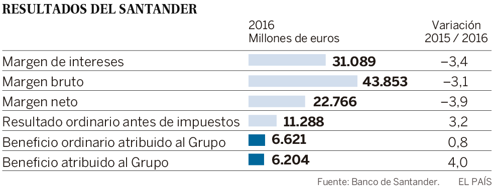 El Santander gana 6.204 millones en 2016, un 4% más por las menores provisiones