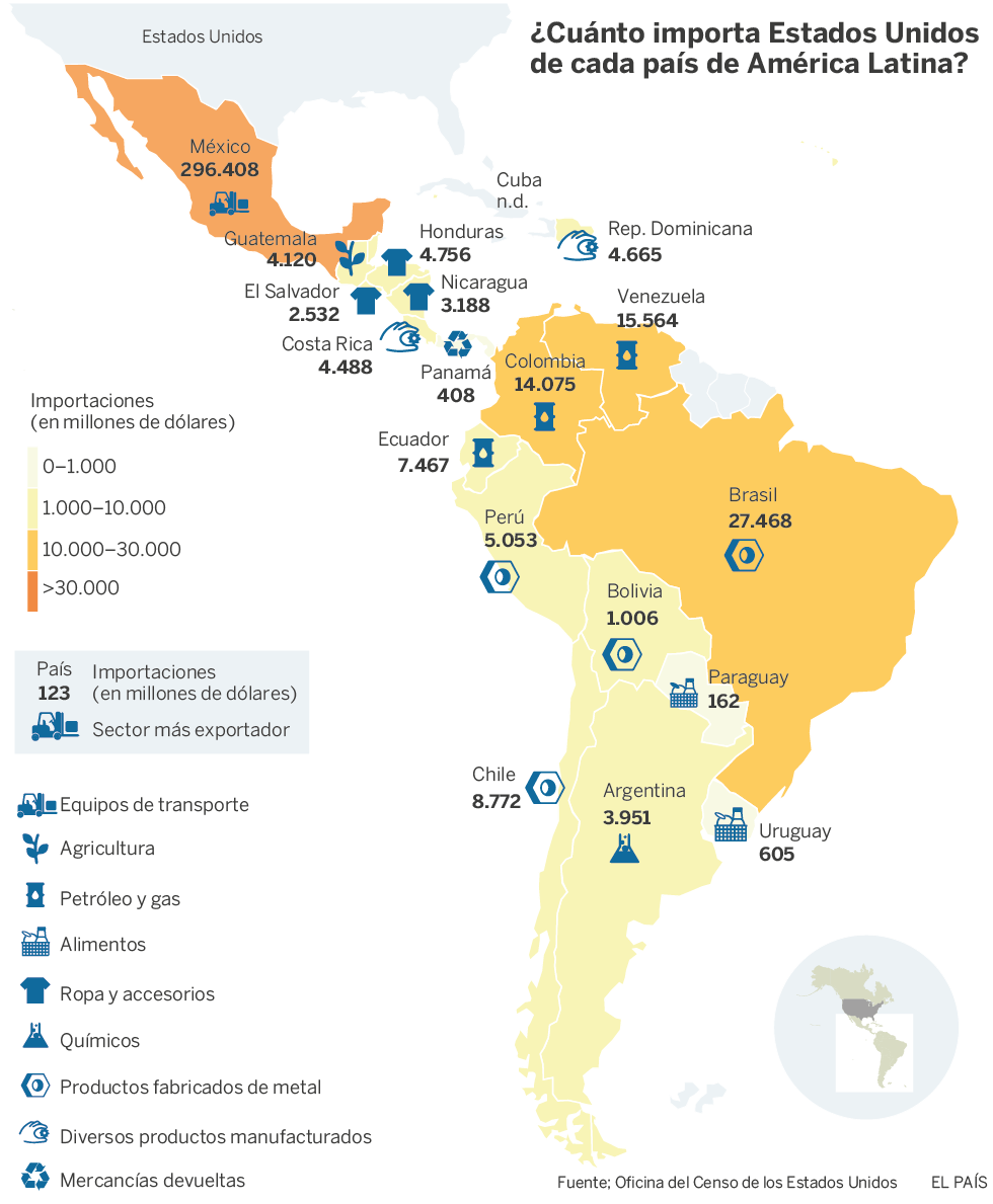Las proclamas de Donald Trump en favor de imponer aranceles a las importaciones se ciernen como una amenaza sobre la economía latinoamericana. En 2015, la región vendió 400.000 millones de dólares (casi un 8% de su PIB) en materias y productos a su gran vecino del Norte, con el que además mantiene superávit comercial. El efecto de medidas anunciadas por el presidente ha suscitado los temores de los países más próximos y más dependientes del intercambio comercial con EE UU, como ocurre en México ante la imposición de aranceles a los automóviles, pero también inquietan a economías más alejadas y menos exportadoras a Estados Unidos; es el caso de Argentina, que ya ha sufrido el veto a la venta de limones. Otros países, en cambio, pueden presumir de una exposición menor a los arrebatos neoproteccionistas de la nueva Administración estadounidense, que también ha puesto en cuestión los acuerdos de libre comercio.