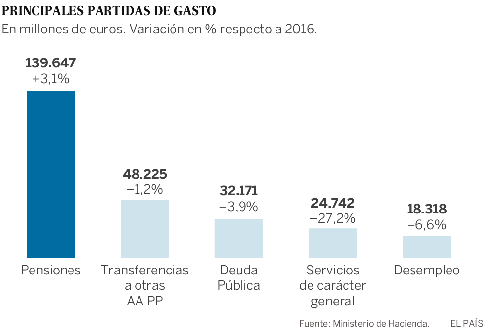 Los gastos de personal ascienden a 22.000 millones, un descenso del 1,6% pese a incluir la subida del 1% en el sueldo de los funcionarios. La bajada se explica porque el Gobierno solo autoriza a sustituir las bajas de los servicios esenciales, sanidad, educación y fuerzas y cuerpos de seguridad y personal destinado en atención al público. En el resto solo se permite una sustitución por cada dos jubilaciones de empleados públicos. Los gastos por intereses, otra de las grandes rúbricas de las cuentas públicas, ascienden a 32.266 millones de euros, un 3,8% menos. Esta disminución se debe, sobre todo, a la política de bajos tipos propiciada por el Banco Central Europeo.