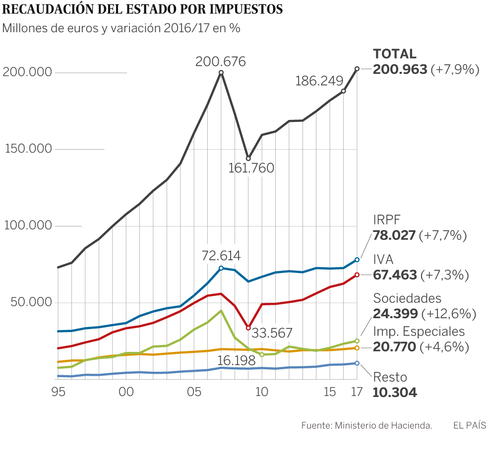 El Gobierno tiene que reducir los números rojos del 4,33% del PIB registrado el año pasado al 3,1% que marca Bruselas. Eso supone un ajuste de cerca de 14.250 millones. Una parte importante llegará por el tirón de los ingresos. El ministro ha presupuestado una recaudación, algo optimistas, de 200.963 millones de euros, un 7,9% más. De cumplirse serán los mayores ingresos tributarios de la historia, superando la marca de 2007, cuando la burbuja inmobiliaria aportaba recursos extra.