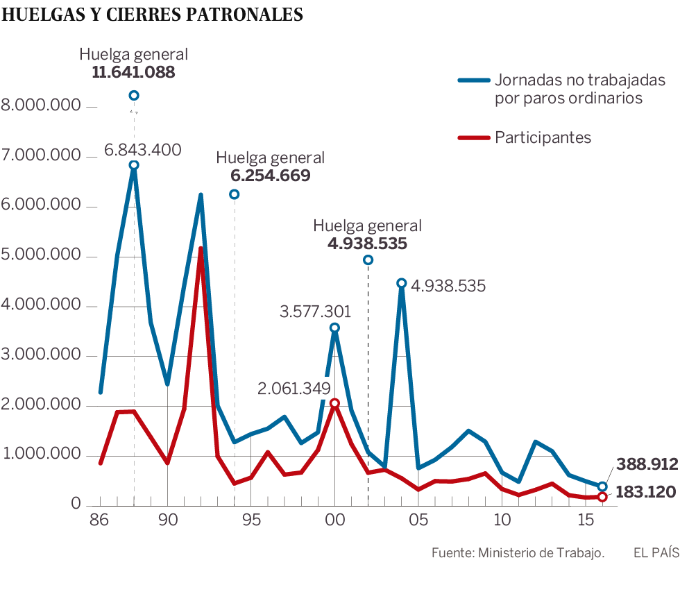 La expresión máxima del conflicto laboral, la huelga, retrocede. En 2016 el número de días no trabajados por huelga cayó al nivel más bajo de la serie que elabora el Ministerio de Empleo. Fueron 388.912, casi 100.000 menos que el anterior mínimo, que se registró en 2011. Sí que subió el número de convocatorias y el de trabajadores participantes. Pero al ser menor la duración, la cifra acumuladas de jornadas bajó. Se mantiene una tendencia que, a pesar de repuntes coyunturales vinculados a la crisis, comenzó hace décadas y no es exclusivo de España, sino que se aprecia en toda Europa.