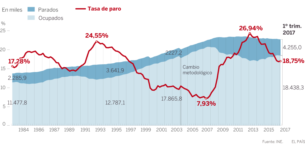 Desde que el mercado laboral toco fondo a comienzos de 2014, el empleo crece con fuerza y el paro se ha reducido de forma significativa. En este último caso se acentúa porque, además de esa intensa creación de empleo, hay que añadir la caída de la población activa. Lo más probable es que la tendencia continúe en los próximos ejercicios. El Gobierno, de hecho, espera que la legislatura acabe con una tasa de paro por encima del 11%, siete puntos menos que ahora.