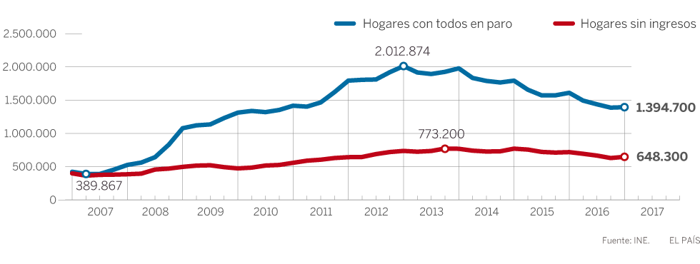 La recuperación del mercado de trabajo ya ha encadenado tres años, pero las heridas de la prolongada crisis y del hundimiento laboral son profundas. Todavía hay bastantes que siguen supurando. Una son los hogares en los que ninguno de sus miembros trabaja, 1,37 millones. Otra, más dramática incluso, es el número de familias en la que ni uno solo de sus componentes percibe ingresos de ningún tipo. Este último dato, casi 650.000 hogares, además, se mejorar al mismo ritmo que el resto de indicadores del mercado laboral.