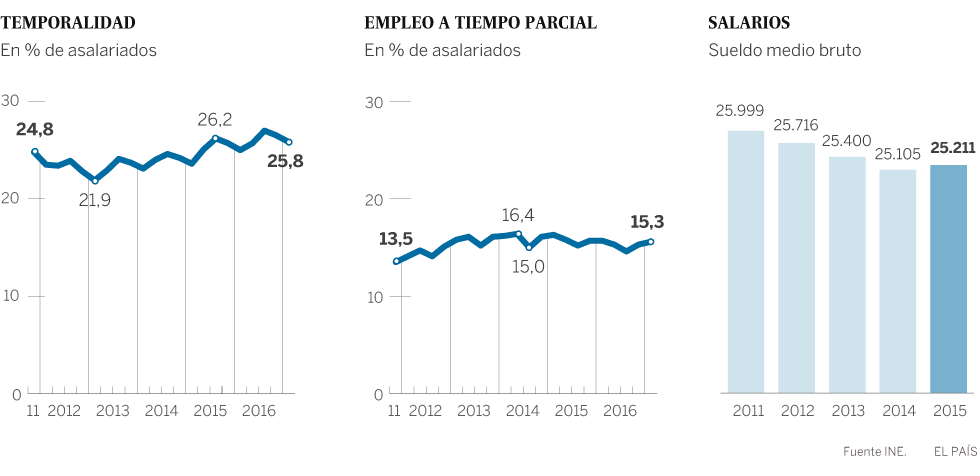 La gran asignatura pendiente del mercado laboral español, con permiso del 18,7% de tasa de desempleo, es la precariedad. Se está creando empleo a un ritmo alto, pero es de escasa calidad. El porcentaje de trabajadores temporales ya es del 25,8% y, con la crisis y los cambios en la legislación del empleo a tiempo parcial, el trabajo por horas ha crecido a niveles inusuales en España, supone el 15,6% del total.