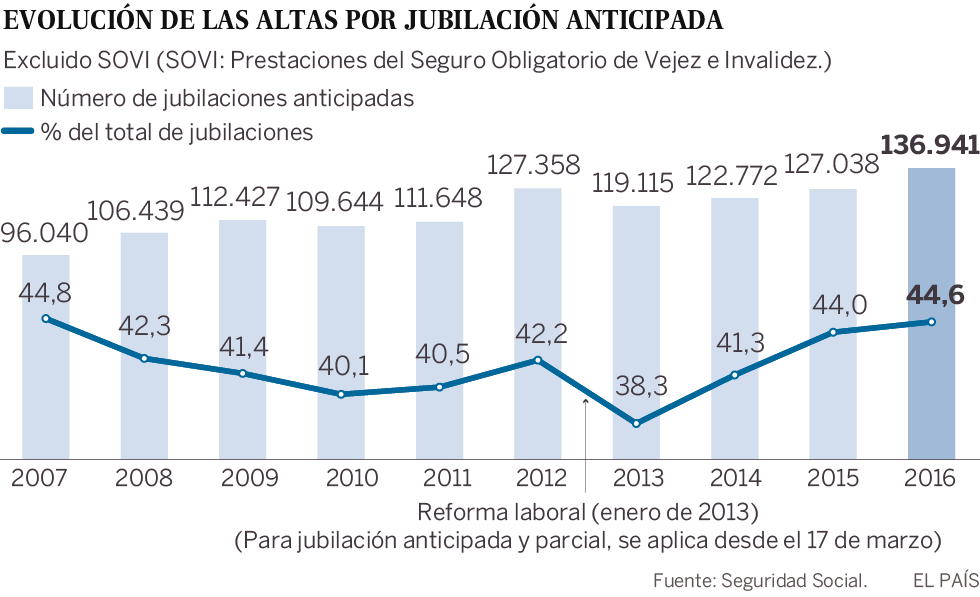 Cada vez son más quienes se jubilan antes de llegar a la edad legal de jubilación, fijada en 65 años y cinco meses para 2017. El año pasado 136.941 españoles se retiraron de forma anticipada, es decir, un 44,6% de un total de 306.890 nuevos jubilados, según la Seguridad Social. Se batió así el récord de 2015, que a su vez rompió el de 2014. En esta evolución se mezcla el efecto combinado del envejecimiento, el volumen de afectados en edades próximas a la jubilación por despidos colectivos (facilitados en la reforma laboral) de la recesión pasada o el efecto llamada de los cambios parciales de la jubilación parcial de 2013. Esta evolución explica que la edad real de jubilación bajara en los últimos ejercicios de 64,33 a 64,08 años.