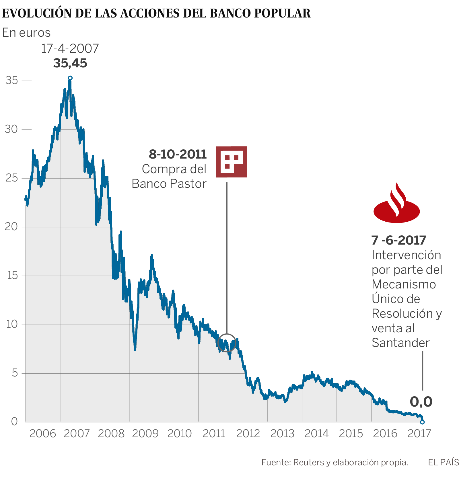 Esa puesta a cero se ha llevado a cabo después de que, para su uso por las autoridades europeas, un experto independiente haya dado al banco una valoración entre -2.000 millones en el escenario central y -8.200 millones en el escenario más estresado o adverso. La propia CNMV ha dejado claro en un comunicado que "todos los accionistas de Banco Popular Español S.A., así como todos los titulares de bonos contingentes convertibles y de bonos subordinados, han perdido totalmente su inversión".