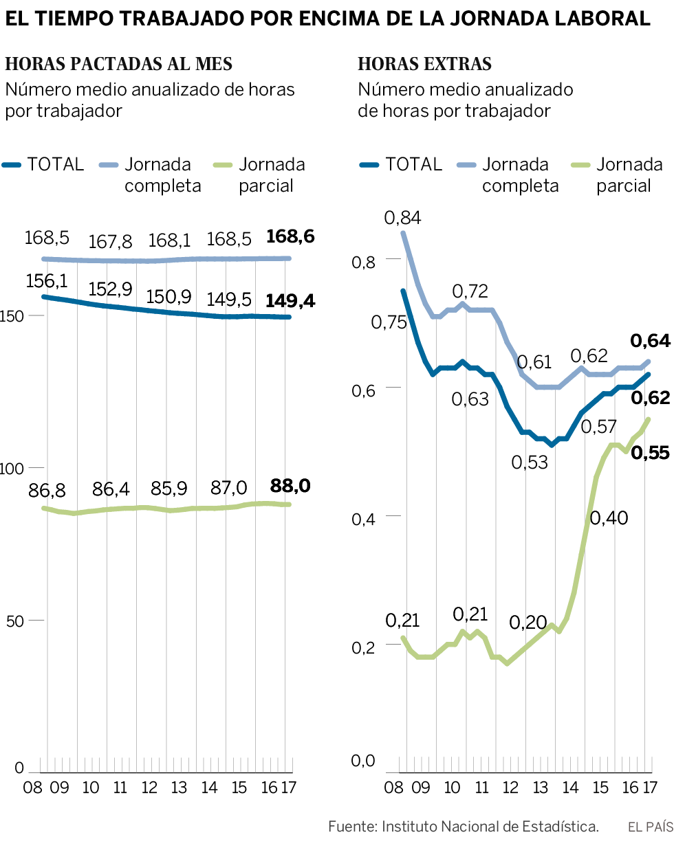 No tienen contratos a jornada completa, pero cada vez trabajan más horas extra. En 2008 los empleados a tiempo parcial hacían al mes una media de 0,2 horas de más, según el INE, es decir, 12 minutos. A comienzos de este año, ese tiempo es de 33 minutos, apenas 5,4 minutos menos que quienes tienen una jornada completa. En España, donde la mayor parte de quienes trabajan a media jornada querían hacerlo ocho horas al día, estos números suponen un “claro indicador” de precariedad, apuntan los expertos.