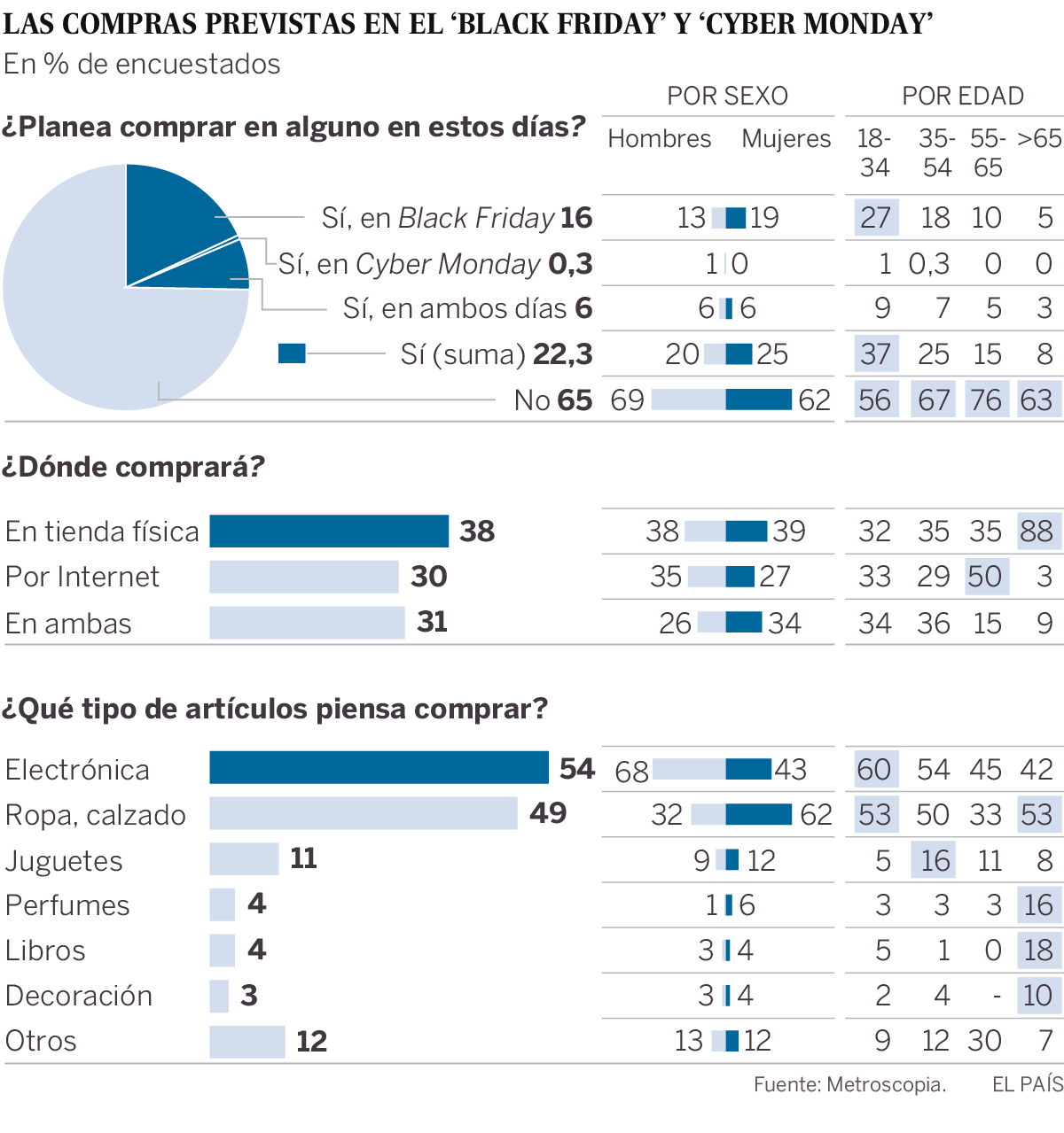 El 22,3% de los consumidores españoles planea hacer alguna compra en el Black Friday, que se celebra este viernes 24 de noviembre, o en el Cyber Monday, que tendrá lugar el próximo lunes, día 27, según una encuesta de Metroscopia realizada para Papallones. Más de la mitad de los compradores se decantarán por productos electrónicos como móviles o televisores, y también aproximadamente la mitad tiene un presupuesto de entre 50 y 200 euros para gastarse en estos dos días de ofertas comerciales.
