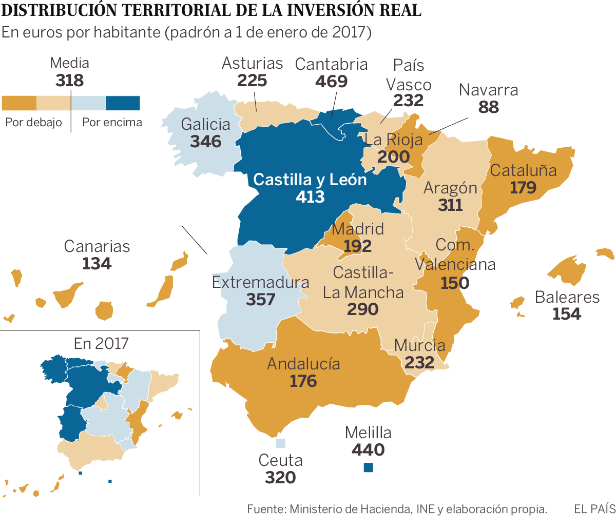 Tras el hachazo que el ministro de Hacienda, Cristóbal Montoro, dio a las infraestructuras en 2017, la inversión crecerá este año en todas las comunidades salvo en Ceuta, Navarra y La Rioja, a las que se ha destinado una cantidad exigua. Andalucía, Cataluña y Madrid, que copan el 40% del capital presupuestado, están a la cabeza de las comunidades que recibirán más dinero para infraestructuras. La inversión crece con mayor intensidad en Castilla-La Mancha, Cantabria y el País Vasco, en este último caso por la construcción del AVE. El PP necesita, además, el apoyo del PNV para sacar adelante las cuentas.