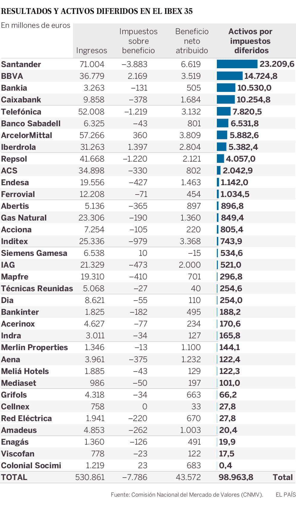 Las 35 empresas que componen el selectivo español acumulan en sus balances cerca de 100.000 millones de euros en activos por impuestos diferidos, que en su mayoría son créditos fiscales que permiten a las compañías reducir el pago del impuesto de sociedades en el futuro de forma completamente legal. Estos créditos fiscales proceden principalmente de pérdidas originadas durante la crisis, pero también están alimentados por provisiones y aportaciones a planes de pensiones de empleados. Bancos y energéticas son las que acumulan más impuestos diferidos. La Autoridad Fiscal ha advertido en varias ocasiones de la pérdida de potencia recaudatoria del impuesto de sociedades, entre otras razones, por estos activos fiscales diferidos.