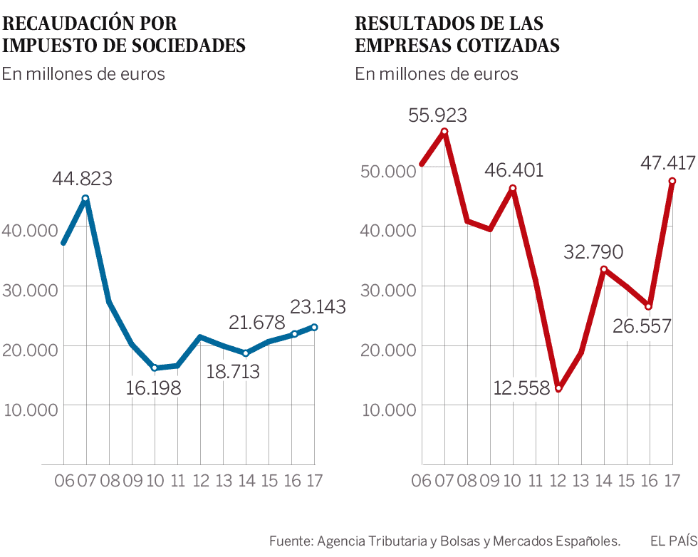 Un vistazo a las estadísticas tributarias permite comprender la dimensión del problema. Mientras que la recaudación del IRPF, del IVA y los impuestos especiales están en máximos históricos, los ingresos aportados por el impuesto de sociedades, poco más de 23.140 millones, son la mitad que en los años de exuberancia inmobiliaria previa a la Gran Recesión, cuando alcanzaron los 44.823 millones.