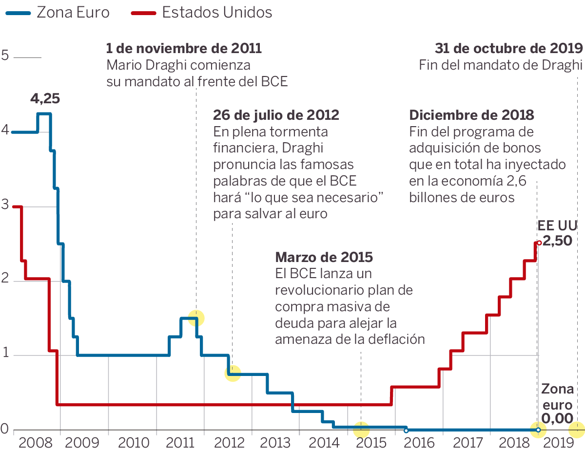 Este cóctel ha hecho que muchos analistas pospongan ya a 2020 la que sería la primera subida en el precio del dinero en ocho años. Incluso el Gobierno español adelanta también esta posibilidad. “Varias economías europeas están registrando crecimientos más bajos, y eso limita las previsiones de incrementos de tipos del BCE”, señaló la semana pasada el secretario general del Tesoro, Carlos San Basilio.