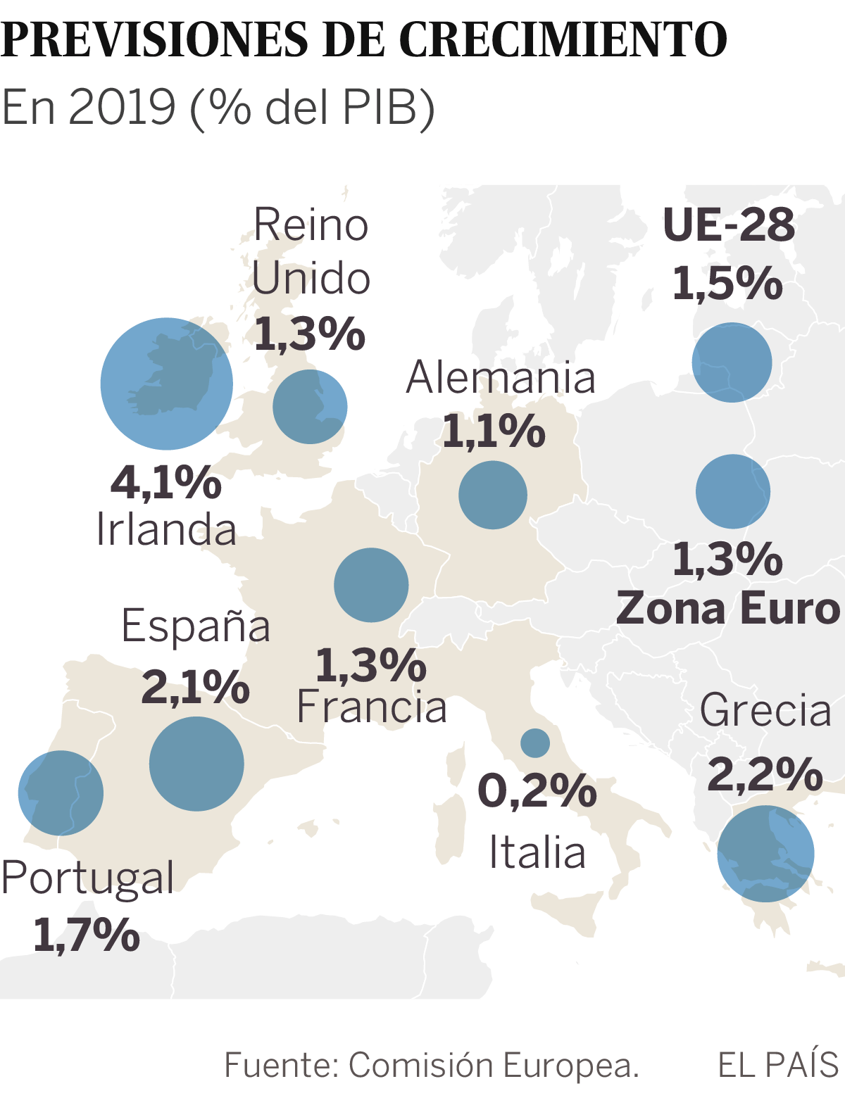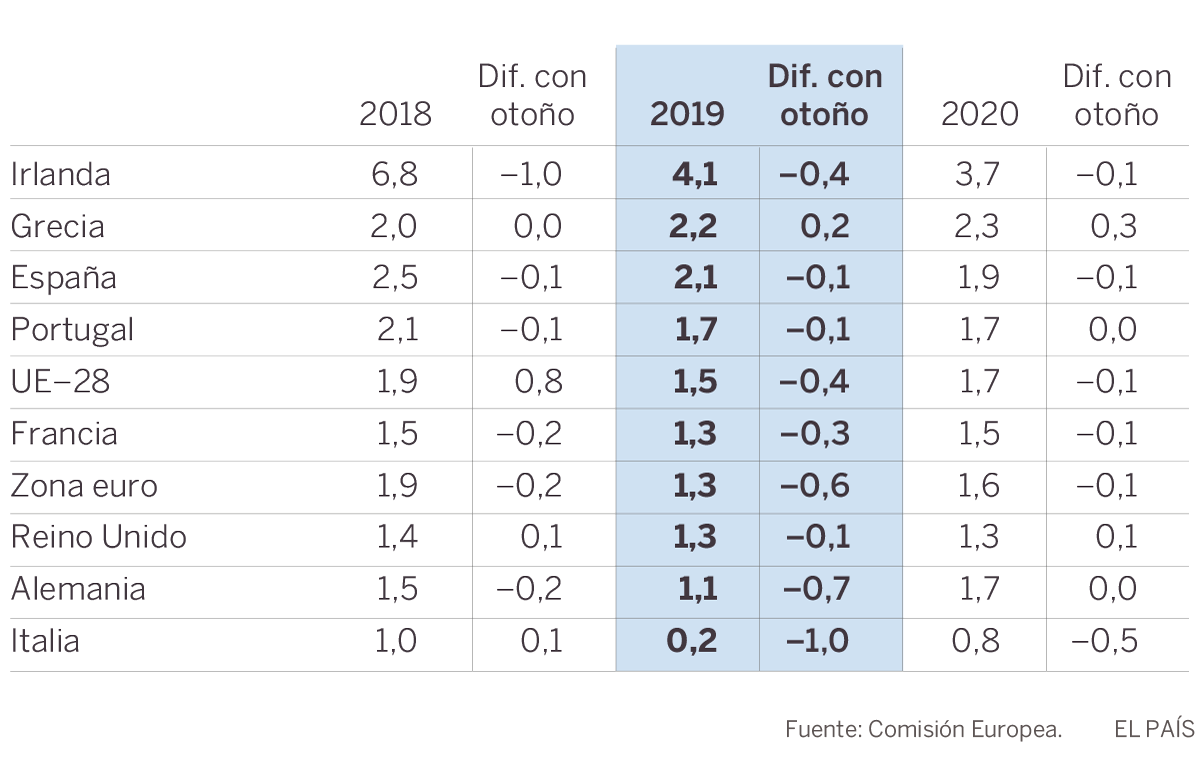 De las otras tres grandes economías, solo España logrará que la bajada sea más suave. Alemania acusará las turbulencias en el comercio mundial y en lugar del 1,8% crecerá el 1,1% este año para luego retomar impulso en 2020 con un aumento del PIB del 1,7%. Las medidas fiscales adoptadas por el gobierno de Emmanuel Macron, según la Comisión, amortiguarán esa tendencia en Francia, cuya expansión económica será del 1,3% en 2019 y del 1,5% en 2020, frente al 1,6% que se preveía en noviembre para ambos años.
