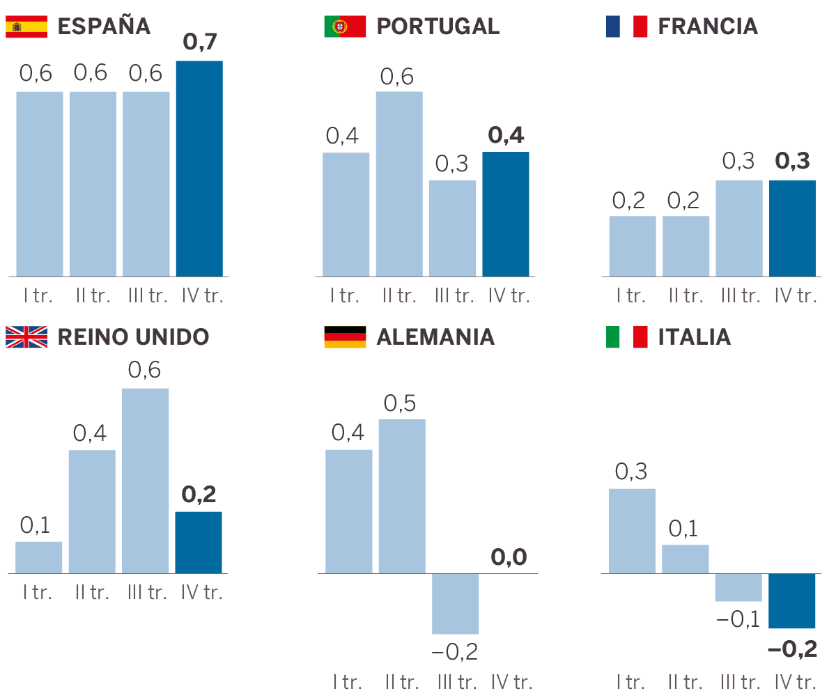 El fantasma de la recesión se ha alejado por la mínima de Alemania, tras conocerse las cifras del cuarto trimestre publicadas por la oficina federal de estadística alemana en Wiesbaden. El crecimiento del PIB se estancó en un 0,0%, evitando así técnicamente la recesión, después de registrar un periodo de crecimiento negativo entre julio y septiembre del año pasado (-0,2%). Estas cifras suponen sin embargo, un claro retroceso respecto al mismo periodo del año anterior y a los primeros seis meses de 2018.