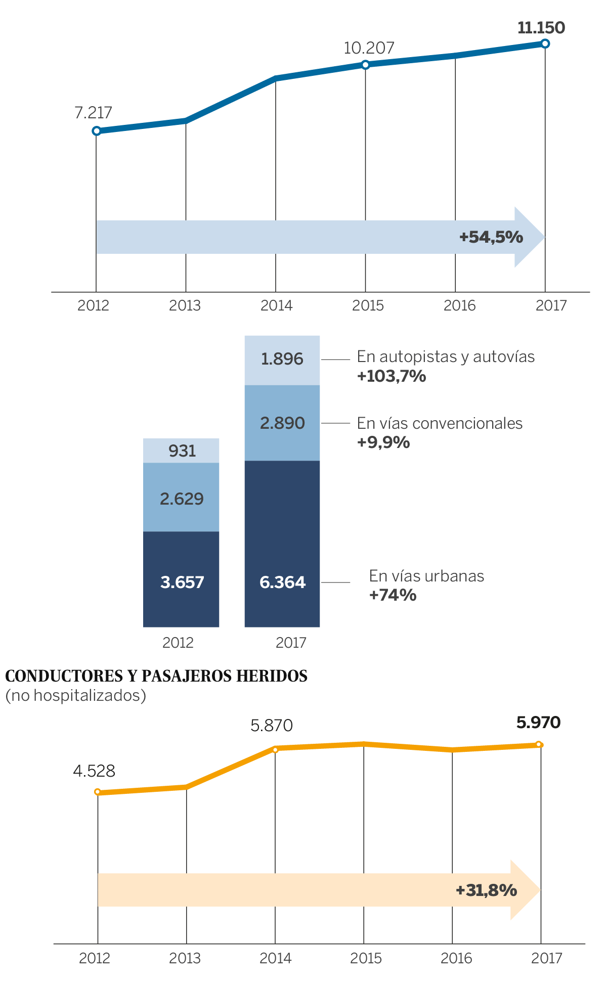 Los datos de la Dirección General de Tráfico (DGT) abruman. El número de accidentes ha crecido un 55% entre 2012 y 2017. Solo en autovías y autopistas, la subida ha sido de más del 100%. Y el número de conductores y pasajeros heridos en accidentes con furgonetas que no han requerido de hospitalización ronda ya los 6.000, un nivel récord desde 2003, y un 32% superior al de 2012. Las víctimas mortales, sin embargo, se mantienen más o menos estables, en torno a una centena cada año, mientras que la tendencia en otro tipo de vehículos ha sido claramente a la baja.