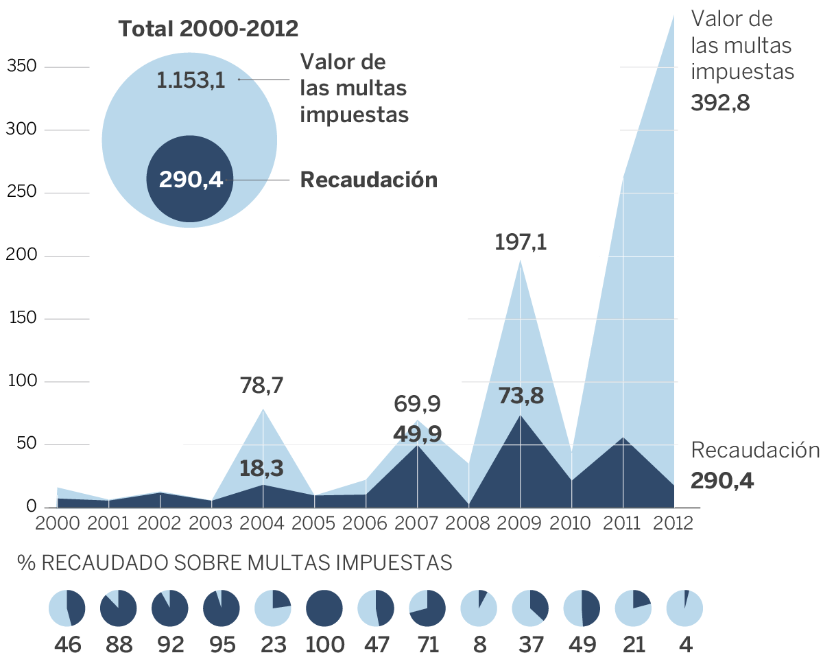 La autoridad de competencia española impuso entre 2000 y 2012 más de 1.153 millones de euros en sanciones a las empresas que incumplieron la legislación, de los que solo ha podido recaudar 290,4 millones de euros. Es decir, solo uno de cada cuatro euros. Únicamente hay un año, 2005, en el que Competencia ha recaudado todo el importe que impuso en multas: 9,8 millones de euros. En el resto de ejercicios, los recursos judiciales de las empresas consiguieron anular algunas sanciones u obligar al regulador a recalcular otras a la baja. Las compañías dan la batalla en los tribunales casi por defecto y los pleitos duran años. La Comisión Nacional de los Mercados y la Competencia (CNMC) reclama un cambio legislativo que agilice el cobro de las multas y más medios técnicos y humanos para aumentar la eficacia del organismo.