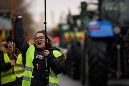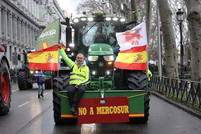 Durante la marcha, que transcurre con muchas banderas con el eslogan “No a Mercosur”, Braulio Hernández, de 53 años, porta una negra con una calavera. Simboliza, según él, “la muerte del campo con el acuerdo” de Mercosur. Este agricultor de ajos de Chinchón (Madrid) vaticina una “invasión de productos” agroalimentarios de América Latina que “va a reducir mucho los beneficios económicos del campo” en España. Por eso pide al Gobierno que presione a la Comisión Europea para que no entre en vigor.