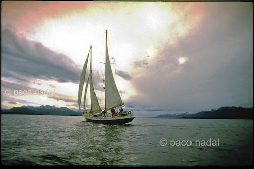 En Ushuaia ya no queda ni una de aquellas tabernas de madera y aire denso en las que los viejos marinos desgranaban historias terribles de naufragios y muertes y los que tenían que embarcar al día siguiente hacia la negrura indómita de Hornos amansaban sus miedos con whisky y ron. Lo que ahora abundan en la calle principal son tiendas de ropa de marca, muebles de diseño, teléfono celulares, ordenadores y clubs de alterne en los que suena la música de Rosana o de Britney Spears, lo que, por otra parte, no quita ni un ápice de interés a la propia aventura de llegar a este punto remoto del mapamundi, de tan difícil acceso que solo pudo ser colonizado hace unas décadas.Navegamos con rumbo 80º y empieza refrescar. Estamos en pleno verano austral, pero la temperatura no sube de 15º. El Valhalla cabecea suavemente en busca de una salida al Atlántico por el canal de Beagle, el paso que une este océano y el Pacífico sin necesidad de bajar hasta el cabo de Hornos y que fue descubierto en 1830 por Robert Fitz-Roy durante el primer viaje del Beagle, el bergantín en el que luego viajaría también como naturalista Charles Darwin. La luz de acero que envuelve el canal es pura magia y acrecienta la sensación de estar en el confín del mundo. Todo, desde el color del mar hasta los brillos solares, parece aquí diferente.Sopla una ligera brisa de seis nudos cuando Pascal, nuestro capitán, saca su pequeña cabeza por la escotilla y olfatea el aire, como un sabueso.?Buen viento. No problemo?