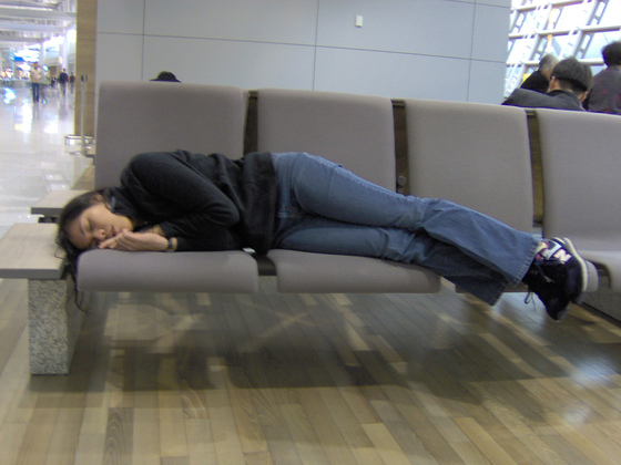La vez que "dormí" en un aeropuerto, fue en el "magnífico" aeropuerto de Sheremetyevo. Por una cadena de errores, me fui sin visado (nunca mais). Tras retenerme el pasaporte y tener una bonita conversación con uno de sus empleados ("you are a criminal trying to enter illegally to our country"), de indicarme donde dormir ("move away from here"), de vigilarme cuando buscaba alguna sala tranquila ("come again where you were"), me acomodé como pude en las sillas de la terminal. Gracias a una familia que viajaba a Bangkok quien me dio de cenar (pensaba cambiar rublos a la salida) y me cedió una manta. Abrazado a mi maleta de mano, dormí un par de horas.