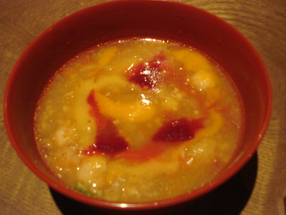 El menú que degusté fue una sucesión de sabores suaves, radicalmente ligeros, repletos de matices y texturas: trompetas fritas con royal de setas y crema de piñones, conjunto amargo, ácido y ligeramente picante; minestrone de ingredientes raros de sabores sutiles; vegetales al vapor con pasta de arroz glutinoso (especialidad de la casa); falso sushi de arroz envuelto en pieles de tofu tostadas con setas enoki braseadas en un ligero escabeche con alga nori. Después soba (fideos japonenes caseros), además de un precioso plato de vegetales fritos y hervidos que simulaban las hojas del otoño. De postre un mochi en versión libre que parecían pancakes y unos sorprendentes candies de té macha.