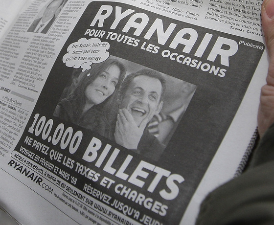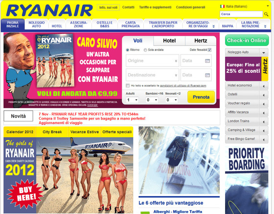 “Caro Silvio un’altra occasione per scappare con Ryanair” ("Querido Silvio, otra ocasión para escapar con Ryanair"), le proponía hace un par de semanas la compañía aérea a Berlusconi, aprovechando, de paso, para promocionar su última oferta. No es la primera vez que Ryanair ficha al Cavaliere para sus anuncios: en otra caricatura, del pasado mes de julio, afirmaba que tenía "560 millones de razones para irse". También han sido modelos involuntarios de sus campañas Nicolas Sarcozy, Carla Bruni, J osé Luis Rodríguez Zapatero y la reina Sofía.