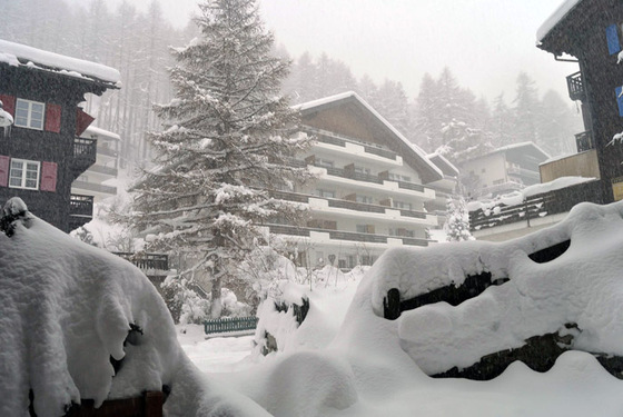 En estos momentos cae una nevada impresionante sobre Zermatt y toda la zona de los Alpes suizos. Parece como si el invierno, después de pensárselo mucho, hubiera decidido llegar de repente y con toda intensidad. Así que hoy es imposible subir a la montaña a grabar imágenes para el trabajo que estoy haciendo aquí. Da pereza hasta salir del hotel. Más aún cuando solo con mirar por la ventana tienes paisajes tan relajantes como los que os dejo aquí abajo. Hoy es un día de libro y chimenea... ¡que bien pensado es un planazo excitante!