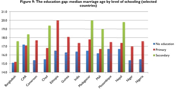 El gráfico adjunto muestra claramente este argumento: en todos los países la edad media del matrimonio se eleva proporcionalmente con respecto a los niveles educativos. En los casos en los que aparece reflejado el indicador de educación secundaria, las niñas llegan al matrimonio casi tres años después que sus compañeras menos educadas.