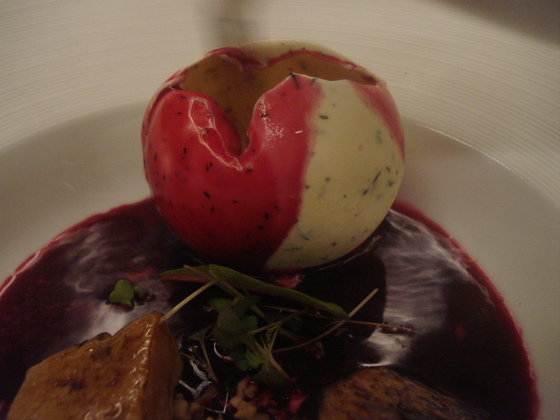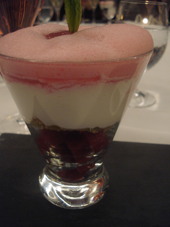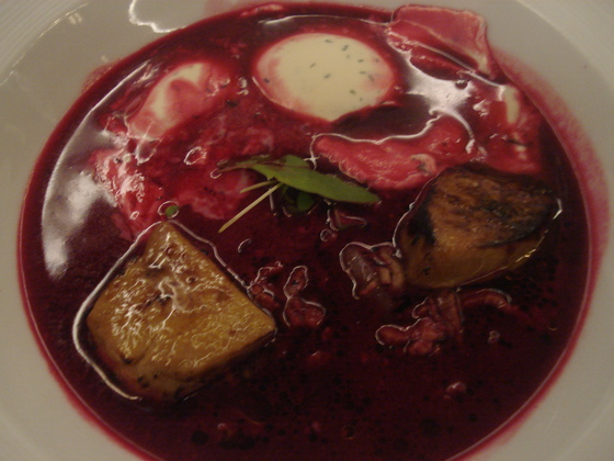 Y al lado de Roncero las creaciones de Komm, que me parecieron más ambiciosas. Primero la composición que denomina “Spring Lawn”, múltiples verduras delicadamente ensambladas en cuyo centro se hallaba un huevo poché inyectado (fallo imperdonable) con una crema líquida al horroroso aceite sintético de trufa blanco. A pesar de este detalle un gran plato. Su segunda creación fue el borscht con foie-gras. Espectacular. Al parecer la cuarta versión que lleva realizada de esta receta. Una crema de remolacha templada que el camarero dejó caer sobre una bola de crema agria que se deshacía con el líquido rojo. A su alrededor, los tropezones del hígado graso del pato. Lo que no convenció a nadie fue su postre, “Armonía de Fresa”, excesivamente contundente.