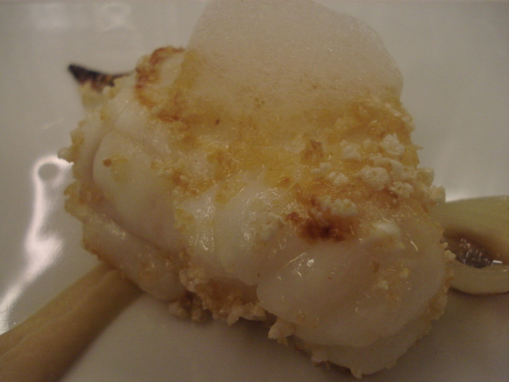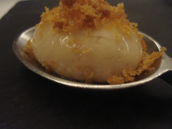 Su cocina no guarda relación con la del maestro. Sus platos son muy técnicos, estéticos y refinados, además de elegantes. En cada una de sus creaciones es fácil reconocer la influencia de una rama de la cocina española contemporánea: el estilo de Martín Berasategui y de sus discípulos. Y de Quique Dacosta en ciertos detalles, a quien Komm admira. Lo suyo no es vanguardia, sino un testimonio de lo que Philippe Regol denominó en su momento “Tercera Vía”. En suma, parte del legado que la cocina española contemporánea está dejando al mundo. Nuestra cena tuvo dos secuencias disociadas. Por un lado platos de Paco Roncero, heredados de Adrià como la croqueta líquida y las huevas de trucha en tempura, a los que acompañaron otros de corte sencillo como la ventresca de salmón o el rape con consomé de garbanzos.