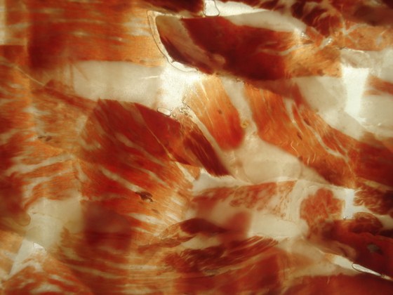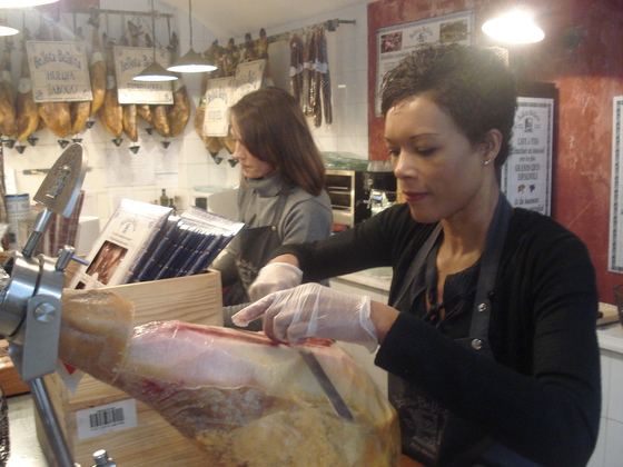 Las piezas se cortan a cuchillo por manos femeninas protegidas por guantes. Cada loncha se dispone sobre papel alimentario. Cada capa se separa de la siguiente por láminas transparentes, y los paquetes se grapan con una ficha de cata en la que se reseñan el tiempo de maduración de la pieza (meses de afinamiento del jamón en bodega), nombre de la maestra cortadora, peso neto y fecha de consumo preferente en caso de que se envase al vacío.Pura cultura gastronómica. Por supuesto, solo comercializa jamones de bellota. Al menos eso pretende. Tan solo comete un error, denominar jamones pata negra a lo que debería calificar de pezuña negra.