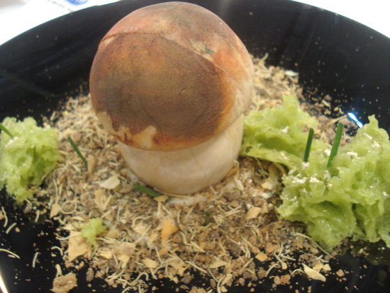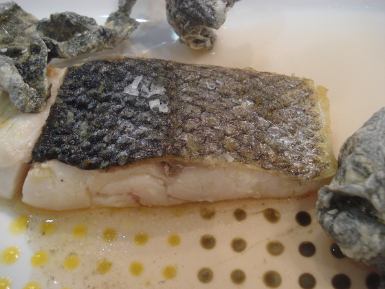 Entrante. Representación del hongo boleto en su habitat. Plato técnicamente excepcional. Al romper el hongo cristalizado aparecen boletos guisados. Lástima, la presencia agazapada del aceite artificial de trufa blanca. Principal: Lubina con caldo de calamar, yema y corteza de seitán. Impecable el punto de cocción.