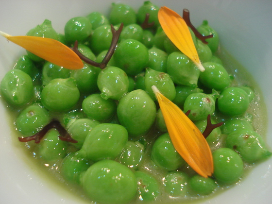 Postre: Lingote de queso de cabra con regaliz y remolacha. Agradable Concursante 2351 Entrante Guisante con alga codium y flor de caléndula. Mal, el sabor del alga anulael gusto de los guisantes. La ración es escasa y no cumple los mínimos del concurso. Principal: Cigala ahumada, hoja de higuera y espinaca en salmuera. Correcto sin que entusiasme.