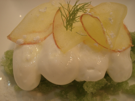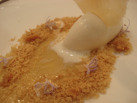 Postre: gianduja de nueces de macadamia con helado de leche ecológica. Armónico, delicado.Hemos atravesado el Ecuador del concurso. El jurado comenta que el nivel es más alto que la edición pasada (2010)