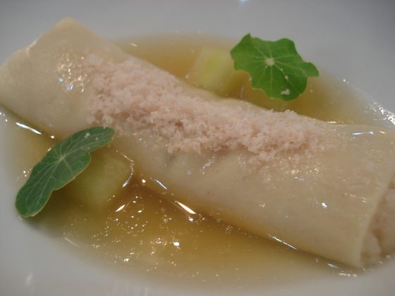 Entrante: Canelón de caballa sobre caldo de pieles de caballa ahumada. Ligero, me entusiasma
