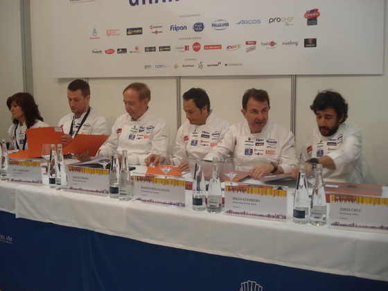 11,30 Aparece Martín Berasategui, risueño y acelerado, como siempre. Poco después, May Hoffman, Jordi Cruz y Sergio Torres, también miembros del jurado. Diego Guerrero y yo habíamos llegado antes a Alimentaria en la misma furgoneta.El director Técnico, Jaime Castellón y sus inspectores se multiplican en sus tareas por todos lados.