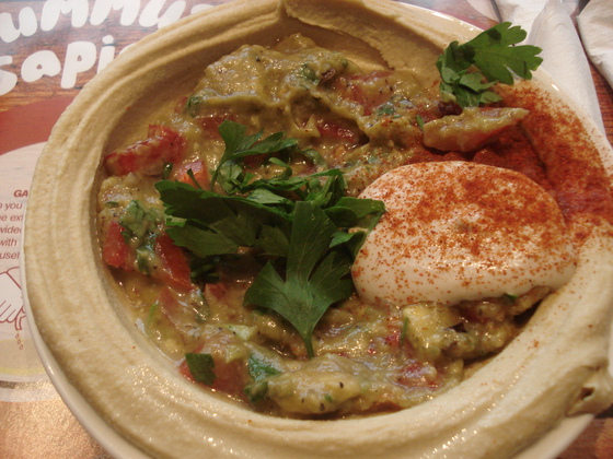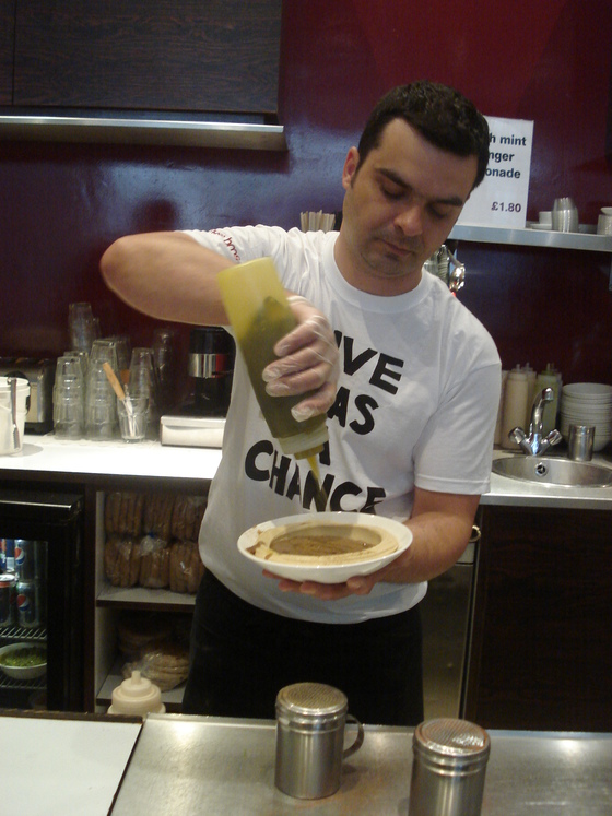 La idea es sencilla. Consiste en utilizar el famoso hummus, crema muy espesa de garbanzos tan típica de países de Oriente Medio y algunos del Mediterráneo (Israel, Siria, Líbano, Grecia, Turquía, Chipre) como fondo de plato sobre el que se ponen cosas encima. Cada variante con precios distintos, pero todas razonablemente asequibles, entre 3,50 y 6,20 libras.