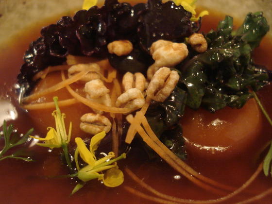 g) Albóndigas de zanahoria con brotes de algas sobre caldo vegetal de primavera.